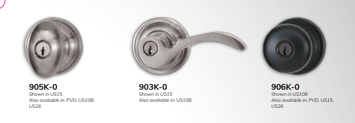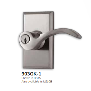 903K-0: This lever-style lockset combines comfort with elegance. It is shown in US15 (Satin Nickel) and also available in US10B and US26 for a customized finish. Its sleek handle ensures easy use, while its solid construction offers superior security.